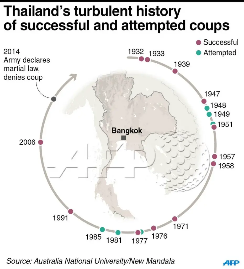 As you can see, this is the 12th since 1932 and the establishment of the Constitution, but if a dozen were successful, there were also seven coup attempts which failed. Political instability is an integral part of Thailand history. And viewing the pattern that repeats constantly, there is good chances that whatever the solution to the crisis will be, the deep divisions in thai society persist.