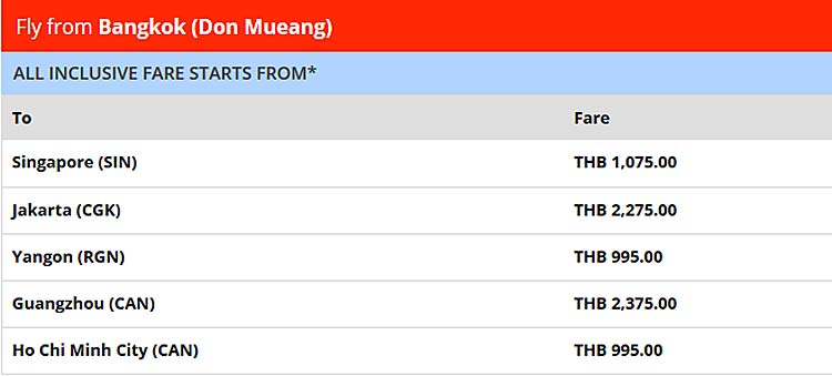 It offers flights from Bangkok (Don Muang) to Chiang Mai, Chiang Rai, Ubon Ratchathani, Udon Thani, Hat Yai, Krabi, Surat Thani or Phuket at 425 baht (€ 11.30).