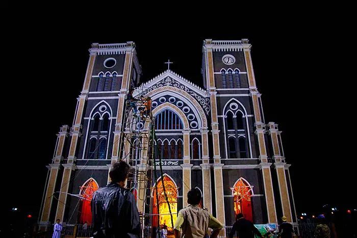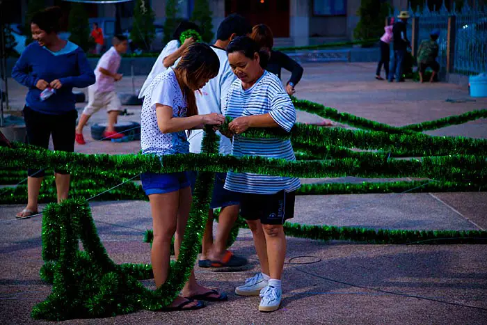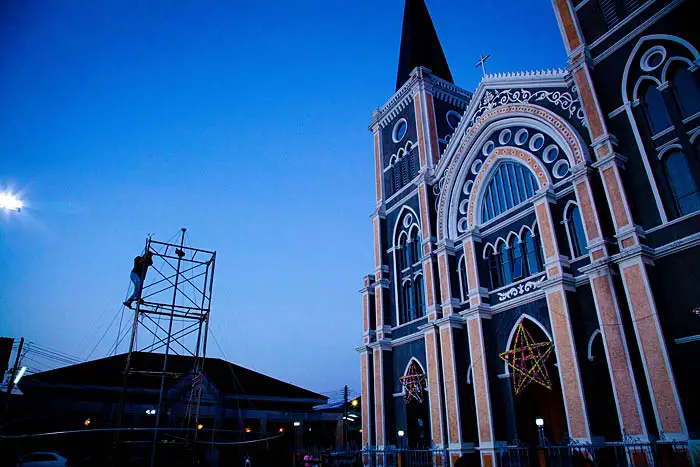 La ville à l’est de Bangkok est connue pour son passé colonial, son marché aux pierres précieuses et surtout son église catholique. La plus grande et la plus belle du pays. Il est donc assez normal qu’ici, Noël, qui avant d’être la fête des marchands de jouets qui se frottent les mains et une fête chrétienne, soit un peu plus présent. Ainsi vous trouverez quelques maisons, essentiellement dans le quartier proche de l’église que les propriétaires ont décorées de guirlandes et étoiles souvent lumineuses. Et quelques jours avant le 25 décembre, sur le parvis, juste derrière la statue d’une Marie accueillante, des paroissiens se retrouvent pour ériger tous ensemble un sapin de Noël. Pas un résineux, juste une représentation faite d’une armature en métal et de guirlandes avec à son sommet une étoile lumineuse. Et c’est tout une organisation pour cette opération qui se fait dans la décontraction et que j’ai suivie, réalisant quelques clichés à différentes étapes du montage du Christmas Tree…