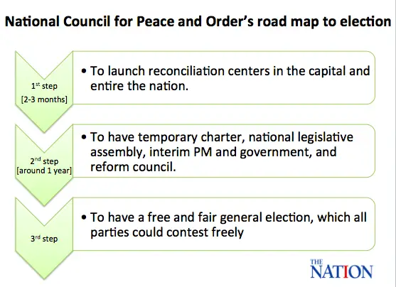Un gouvernement provisoire sera formé à temps pour gérer le budget de l’Etat pour l’exercice 2015 (en octobre au plus tard donc) mais pas d’élections avant 15 mois au moins, a déclaré dans un discours télévisé le général qui a également présenté un vaste plan visant à réformer le pays avant de retourner à un gouvernement élu “dans des conditions que tout le monde peut accepter”.