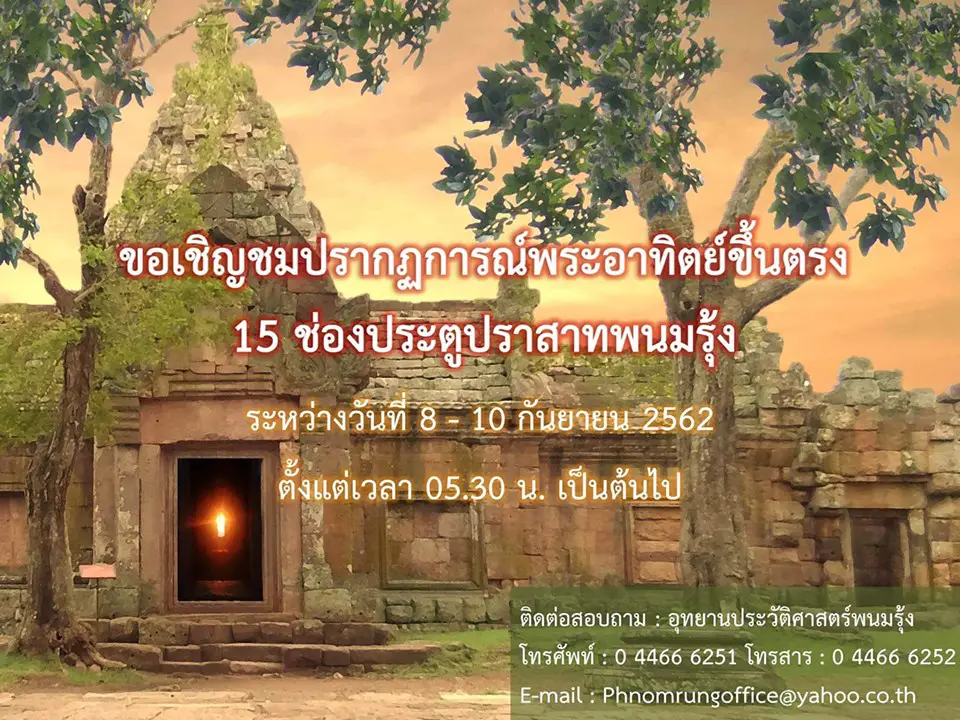 Quatre fois par an, le parc historique de Khao Phanom Rung dans la province de Buriram offre un spectacle rare à tous les visiteurs : le lever ou le coucher du soleil à travers les 15 portes parfaitement alignées du temple khmer du Phanom Rung, un monastère ancien et vénéré construit sur un volcan éteint.